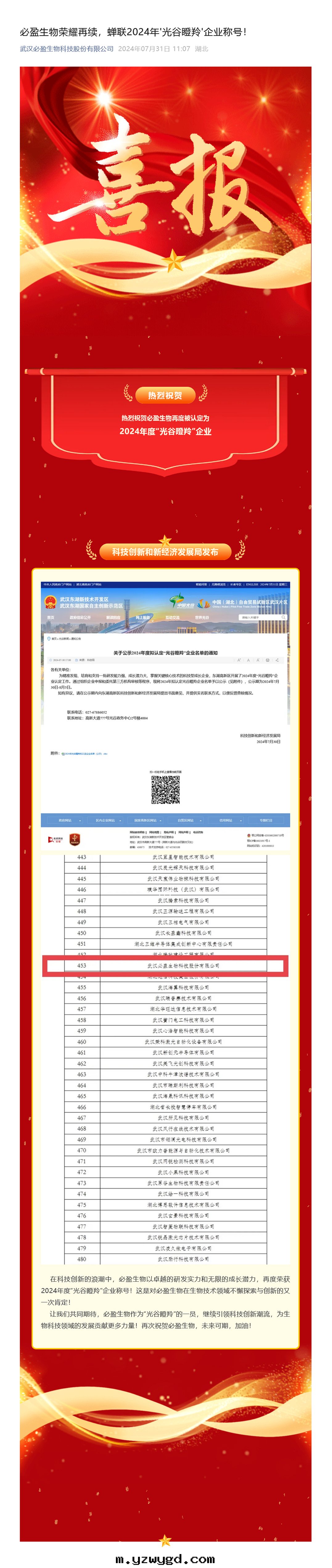 必盈生(shēng)物(wù)榮耀再續,蟬聯2024年(nián)'光(guāng)谷(gǔ)瞪羚'企业稱号(hào)!