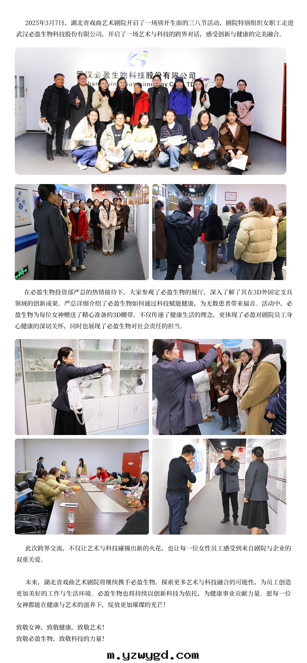 | 2025年(nián)3月(yuè)7日(rì),湖(hú)北(běi)省(shěng)戲曲藝术劇院(yuàn)開(kāi)啟了(le)一(yī)场别開(kāi)生(shēng)面(miàn)的(de)三(sān)八(bā)节(jié)活動(dòng),劇院(yuàn)特(tè)别组織女職工走(zǒu)進(jìn)武漢必盈生(shēng)物(wù)科技股份有(yǒu)限公(gōng)司 |