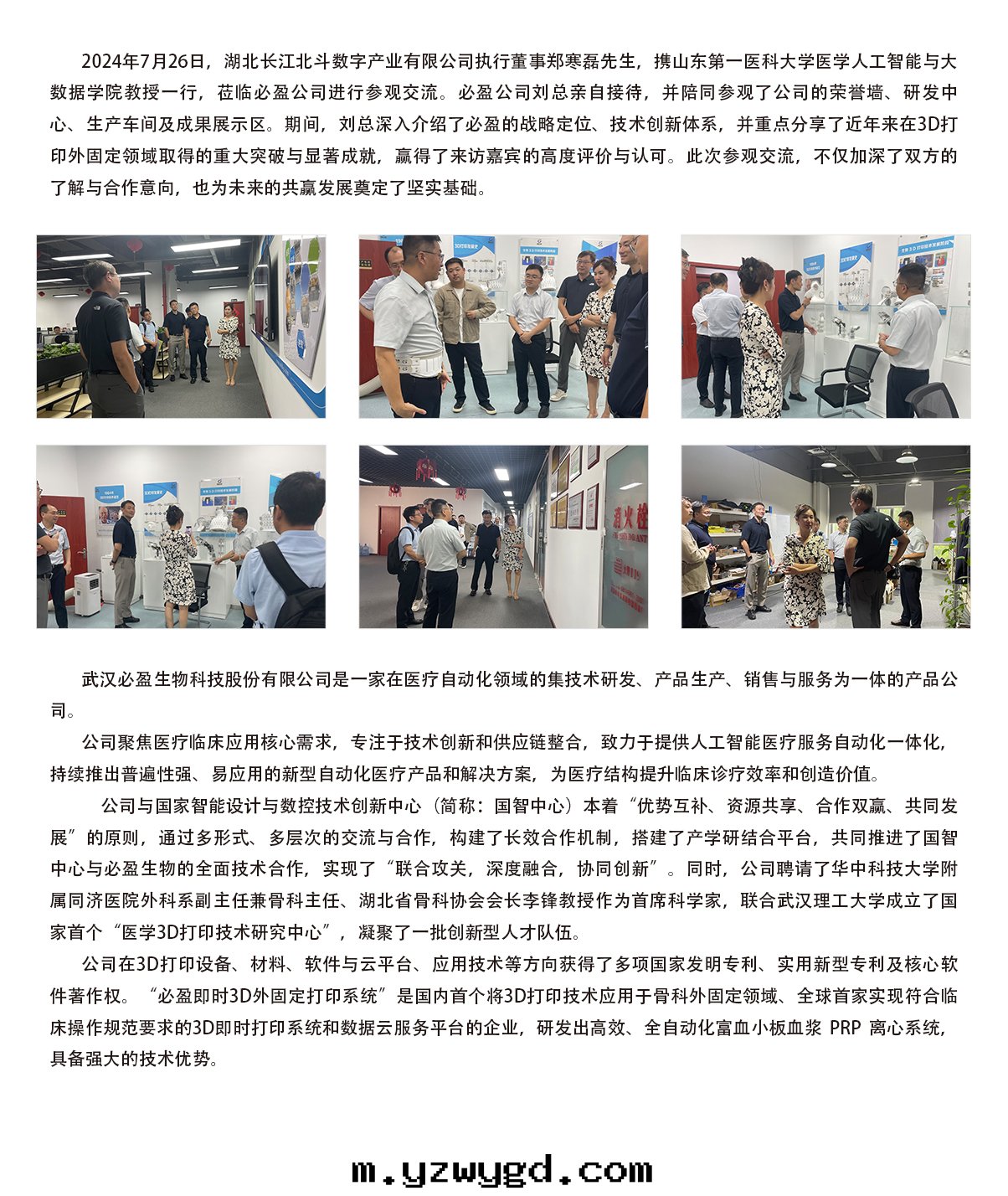 | 2024年(nián)7月(yuè)26日(rì),湖(hú)北(běi)长(cháng)江北(běi)斗(dǒu)數字(zì)産业有(yǒu)限公(gōng)司執行董事鄭寒磊先(xiān)生(shēng),攜山(shān)東(dōng)第(dì)一(yī)医科大學(xué)医學(xué)人(rén)工智能(néng)與(yǔ)大數據(jù)學(xué)院(yuàn)教授一(yī)行人(rén)參觀必盈 |