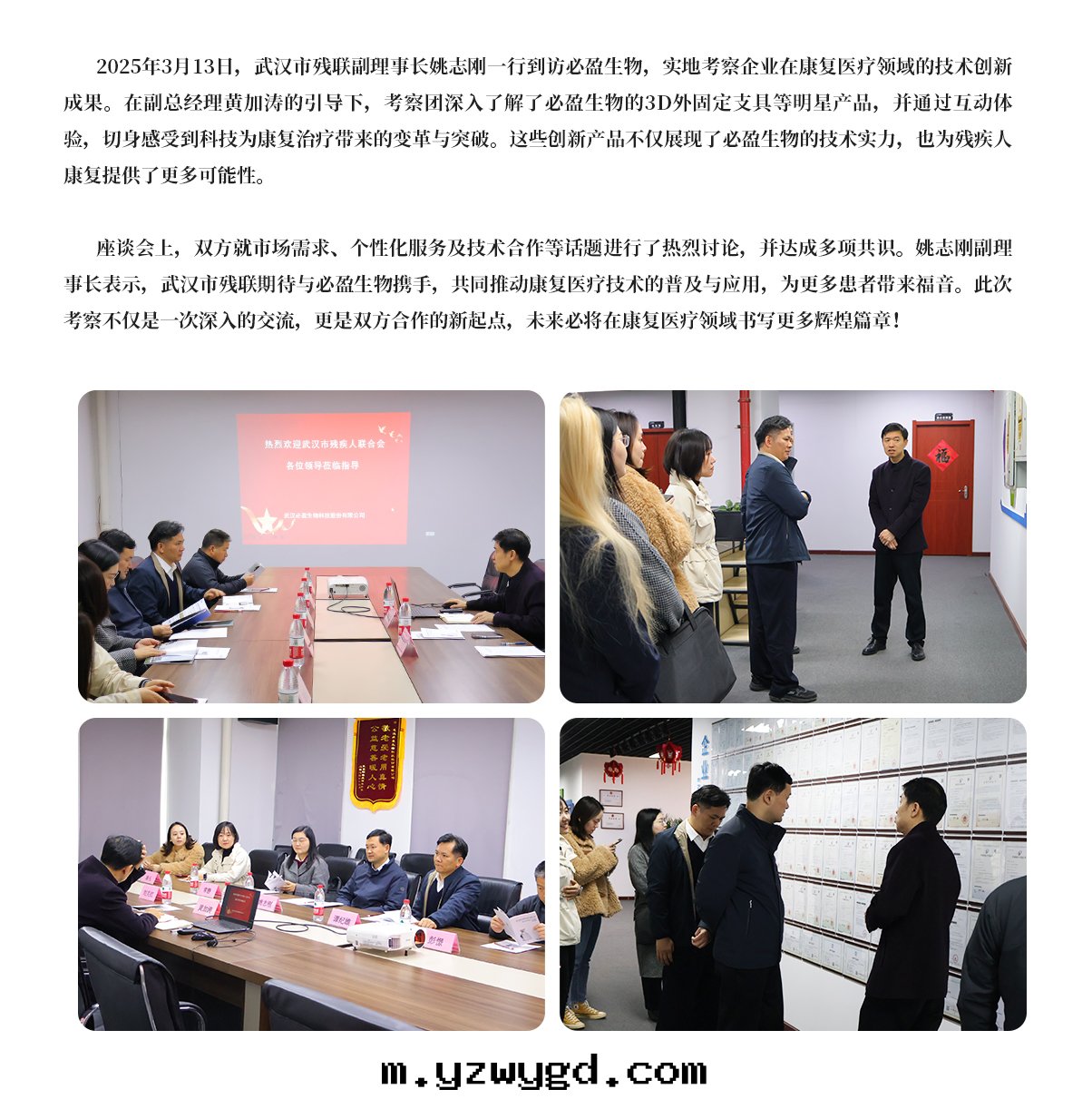 2025年(nián)3月(yuè)13日(rì)热(rè)烈歡迎武漢市残疾人(rén)聯合会(huì)副理(lǐ)事长(cháng)姚志剛等多(duō)位(wèi)领導莅臨必盈生(shēng)物(wù)指導公(gōng)司。必盈副總(zǒng)經(jīng)理(lǐ)黃加濤(tāo)热(rè)情(qíng)接待