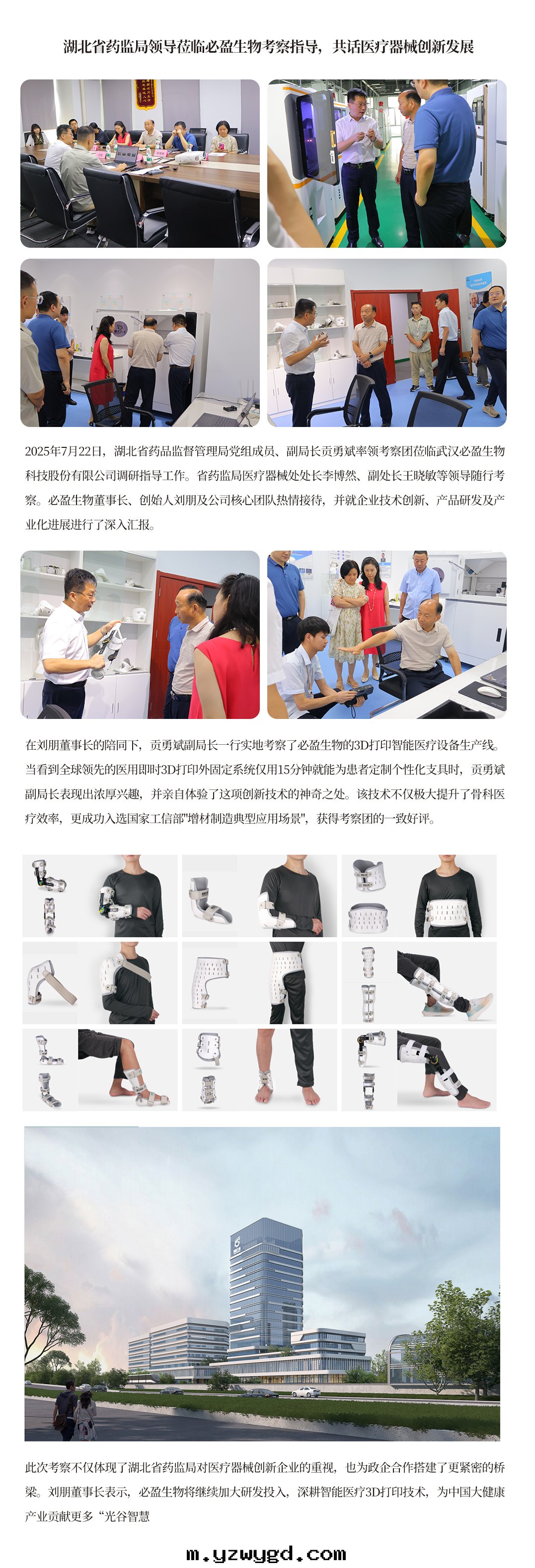 2025年(nián)7月(yuè)22日(rì)湖(hú)北(běi)省(shěng)藥監局(jú)副局(jú)长(cháng)貢勇斌、医療器械處(chù)處(chù)长(cháng)李博然、医療器械處(chù)副處(chù)长(cháng)王曉敏一(yī)行人(rén)莅臨必盈考察工作