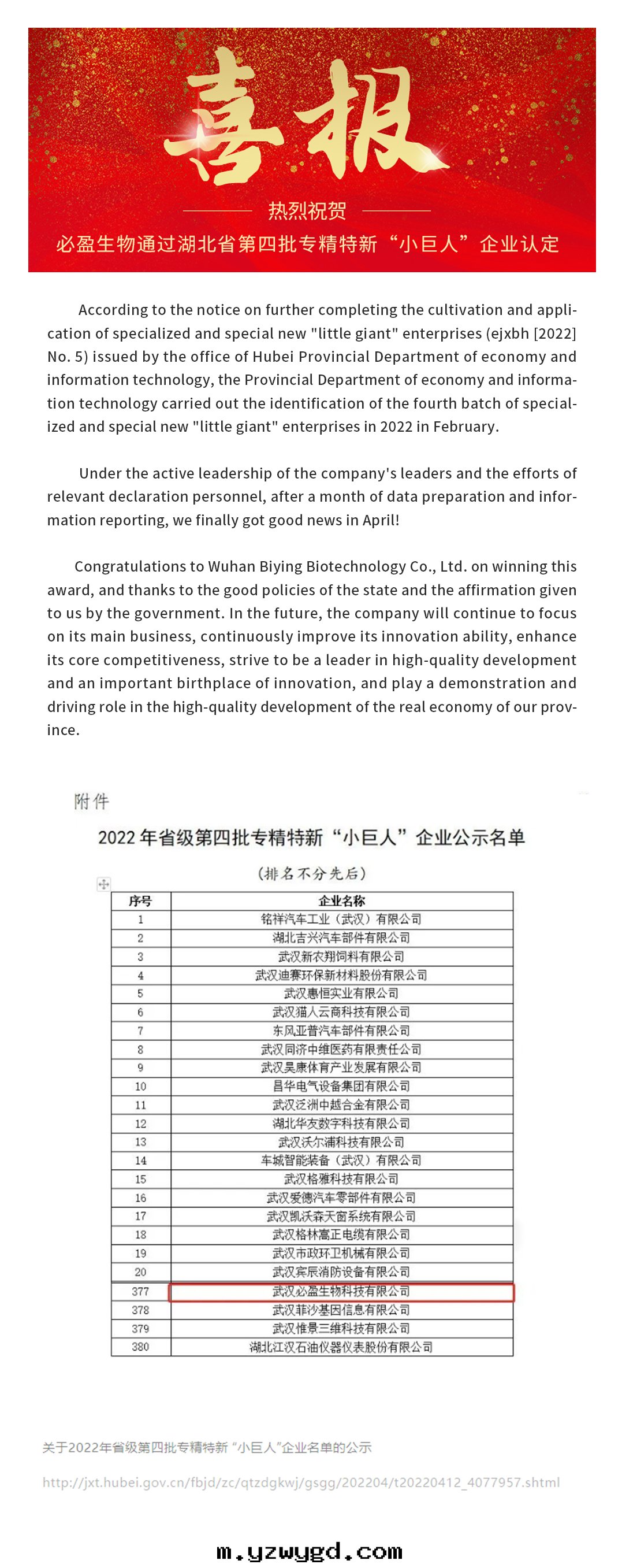 Warmly celebrate that Biying biology has passed the recognition of the fourth batch of specialized and special new "little giant" enterprises in Hubei